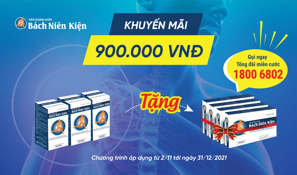 Để hỗ trợ người bệnh có được dịch vụ chăm sóc sức khỏe xương khớp tốt nhất. Vừa Chất Lượng - vừa Tiết Kiệm chi phí. Viên xương Khớp Bách Niên Kiện triển khai chương trình Tri Ân khách hàng lớn nhất từ trước tới nay. Bách Niên Kiện gửi tặng chương trình ưu đãi đặc biệt "TRỊ GIÁ LÊN TỚI 900.000 VNĐ” từ ngày 02/11 đến 31/12/2021. Khi tích đủ 12 điểm, quý khách sẽ được nhận 4 hộp Bách Niên Kiện 10 viên và Khi tích đủ 24 điểm sẽ được nhận 9 hộp Bách Niên Kiện 10 viên