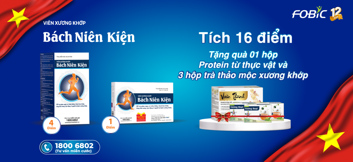 Mừng Đại lễ Quốc Khánh 2/9 và Kỷ niệm 12 năm thành lập Dược phẩm FOBIC, Bách Niên Kiện gửi tới quý khách hàng ưu đãi khủng - giá trị quà tặng lên tới 1.245.000đ khi đặt mua sản phẩm. Số lượng quà tặng có hạn! Nhanh tay gọi ngay 1800 6802 để được tư vấn miễn phí!