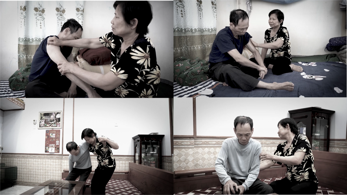 Vợ ông Minh nghẹn ngào: “Ông ấy bị đau nhức như thế là khổ lắm! Có lúc ngồi xuống đứng lên là ông ấy không đứng lên được. Mình lại phải rước ông ấy dậy, nhiều lúc mình cũng liêu xiêu theo ông ấy. Đêm mà ông ấy đau không ngủ được là cũng phải đấm bóp hộ. Tôi cũng yếu, nhưng mà nghĩ thì lại thấy thương nên cũng phải cố gắng.”